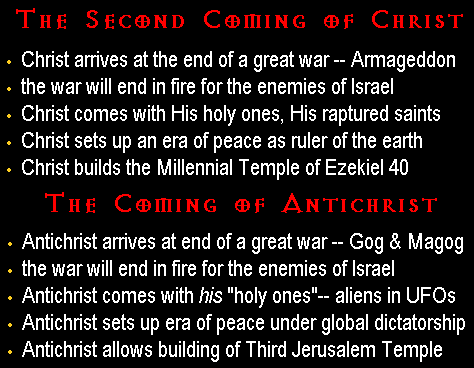 "The causes behind UFO sightings, abductions, and other paranormal phenomena are more malignant and awesome than any theory scientists have proposed . The tribulation, or End Times will officially begin when (Dan.9:27) Israel signs a treaty with the head of the government of unified Europe to establish a Jewish temple in Jerusalem and resume the ancient sacrificial system of worship there.   Careful investigation of these texts reveal a connection between Antichrist and the phenomena of UFOS. Daniel 11 describes the Anti christ:
